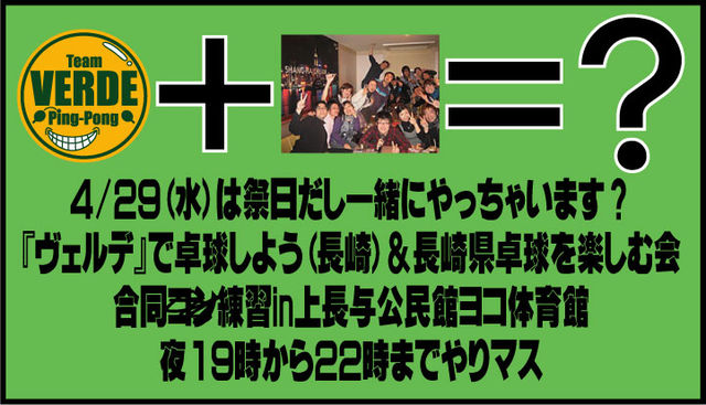 ついに夢のコラボ企画が実現となりマス なるなる様率いる長崎県卓球最大コミュ『長崎県卓球を楽しむ会』 とっ チーキー率いる成り上がり卓球コミュ『ヴェルデ』で卓球しよう(長崎) 合同練習開催です