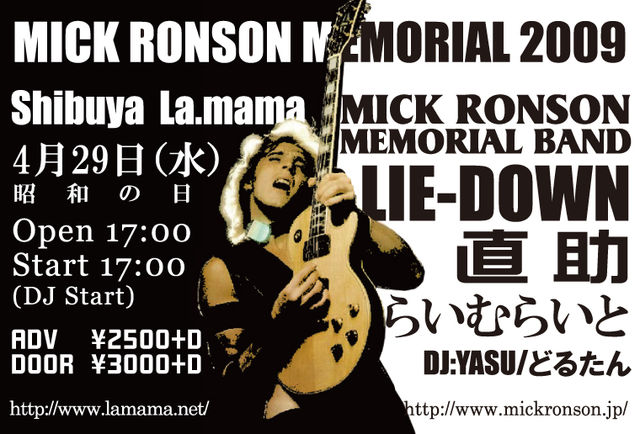 2009年のMICK RONSON MEMORIALは 日時:4月29日(水・祝日)17:00〜 場所:渋谷・La.mama http://www.lamama.net/renew/index01.html 出演:LIE-DOWN、らいむらいと、直助、MICK RONSON MEMORIAL BAND DJ YASU、drtn 前売り¥2500、当日¥3000(ドリンク別) ミック・ロンソンをリスペクトするバンドのライヴ演奏と ビデオ上映、DJ。