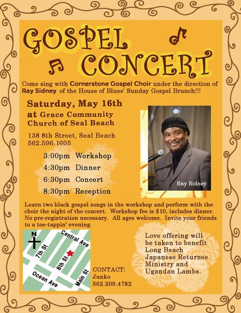 Come learn a few gospel songs under the direction of Ray Sidney and the House of Blues' Sunday Gospel Brunch and come to the workshop. Then sing with the Cornerstone Gospel Choir the night of the concert. Cost is $10 and includes dinner. Concert is free. No pre-registration is necessary.