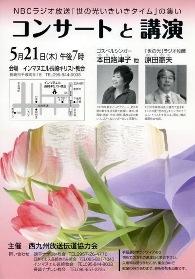 世の光ラジオ放送の集いがあります。 音楽ゲストは、数年前に活水中高の一日修養会のゲストにも いらしたことのある本田路津子さんです。 講師は原田憲夫牧師です。ぜひご参加ください。 <入場は無料で、席上の参加自由の献金があります。> 手話通訳のボランティアにお友達もご一緒に来てくださいます。