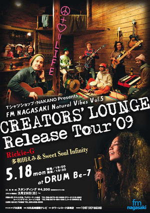 <Tシャツショップ・NAKANO Presents FM NAGASAKI「Natural Vibes Vol.5」〜CREATORS‘LOUNGE Release Tour’09〜> 開場:19:00/開演:19:30 出演:Rickie-G/多和田えみ&Sweet Soul Infinity 料金:スタンディング ¥4,200(整理番号付・1ドリンク別) 一般発売日:3/29(日) 問合せ:FM長崎 TEL:095-828-2020 PC:http://www.fmnagasaki.co.jp/event/rickie_tawada.html プレイガイド:チケットぴあ、ファミリーマート各店 TEL:0570-02-9999(Pコード:318-680)/ローソンチケット、ローソン各店 TEL:0570-084-008(Lコー