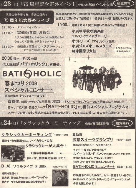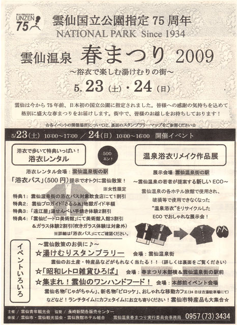 雲仙は今年日本初の国立公園に指定されて75周年を迎えます。 雲仙国立公園指定75周年記念のイベント 雲仙温泉春まつりに昨年に引き続きゴスペル・クワイヤGLORYはライブ出演します。 ■日時:2009年5月23日(土) 19:00〜 GLORYの出演時間は 19:20〜19:40の予定 ■場所:湯せんぺい遠江屋前広場 特設ステージ(国道57号線沿い) ■賛美するゴスペルは以下の4曲です。 ?新しい力 ?詩篇25(作詞・作曲:藤波慎也) ?Amazing Grace ?Halleluj