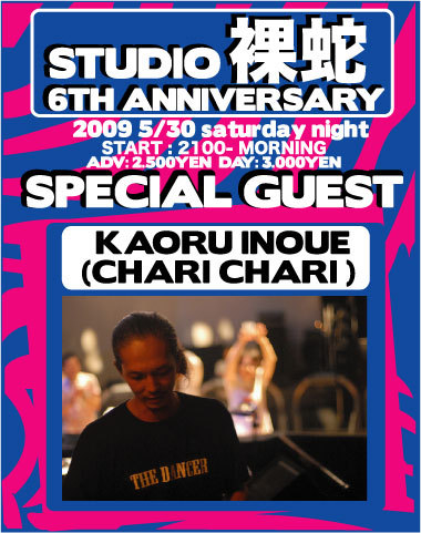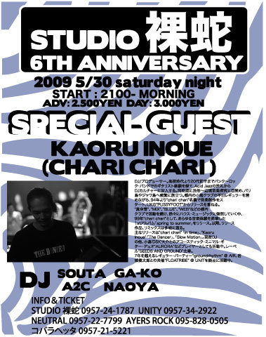 管理人様、告知失礼します。 〜STUDIO裸蛇 6TH ANNIVERSARY〜 2009.05.30(土) AT STUDIO裸蛇 OPEN/START:21:00〜MID NIGHT ADV: 2.500YEN DAY: 3.000YEN MUSIC:TECHNO,HOUSE SPECIAL GUEST DJ Kaoru Inoue aka chari chari DJ SOUTA GA-KO A2C NAOYA VJ Poopie Kewpie --Profile-- 井上 薫 (Kaoru Inoue) DJ/プロデューサー。高校時代より20代前半までパンク〜ロッ ク・バンドでのギタリスト経験を経て、Acid Jazzの洗礼から DJカルチャーに没入する。同時期に民俗〜辺境音楽探究に目覚め、バ