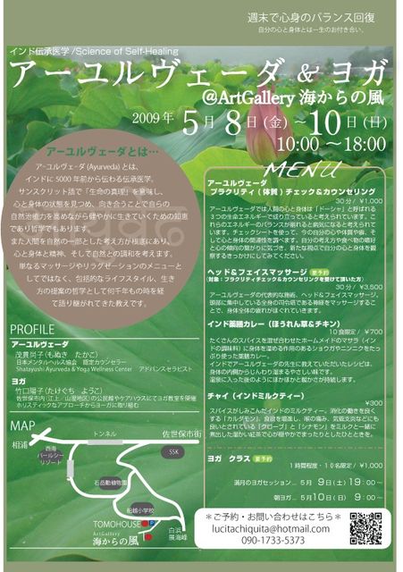 九十九島ファミリーのみなさん、こんにちは! 九十九島を望む古民家アートギャラリー「海からの風」(佐世保市船越町)にて インドの伝承医学「アーユルヴェーダ」とヨガのイベントを行います。 カヤック同様アーユルヴェーダもより良い生き方の提案といいますか ライフスタイルのエッセンスです。 日本ではエステやマッサージの一つとして導入されていることが多いですが 「Science of Self-Healing」とも言われ マッサージよりもより健やかに生きて行くために自分自身で 自然治癒力を高めていくことを重視しています。 まずは自分自身の
