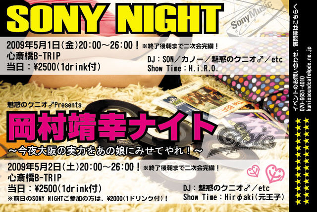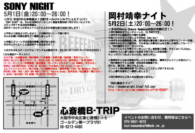 お待たせ致しました。 今年初の大阪、GW開催お知らせです。 この日は拡大スペシャルで、 東京と同時開催でお届けの夜となります! “岡村靖幸ナイトin大阪” 〜今夜大阪の実力をあの娘にみせてやれ!〜 日時:5/2(土)20:00〜26:00! ※終了後朝まで二次会完備! 場所:心斎橋B-Trip 06-6213-4480 住所:大阪市中央区東心斎橋2-1-5ゴールデン第一プラザB1 http://ayayanight.fc2web.com/next/images/img-btrip_map.gif 当日:\2500(1drink付) DJ&Presenter:魅惑のクニオ♂/etc Show Time:Hirφaki(元王子) <本