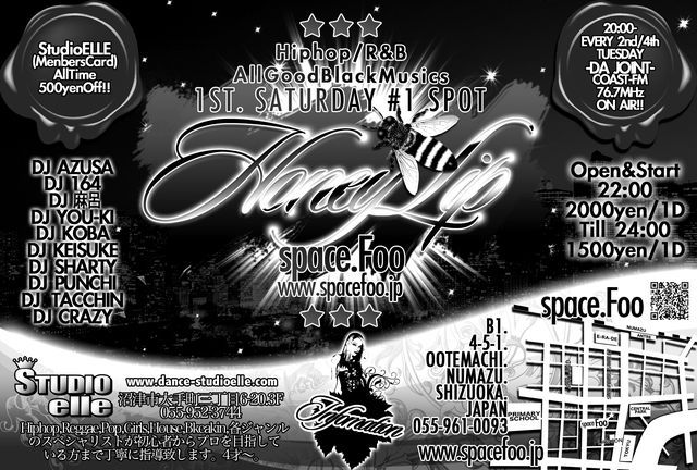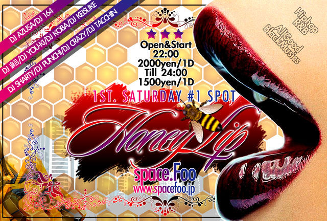 毎月、第1土曜に開催!! 『HONEY LIP』 ALL BLACK MUSIC PARTY OPEN 22:00 22:00〜24:00 1500yen (+1 Drink) 24:00〜5:00 2000yen (+1 Drink) ※Studio elle Members 500yen OFF ※Military(米兵) Discount 500yen OFF ★RESIDENT & ROTAITION DJ'S★ DJ AZUSA DJ 164 DJ 麻呂 DJ YOU-KI DJ KEISUKE DJ KOBA DJ PUNCHI DJ TACCHIN DJ SHARTY DJ CRAZY ★Pruduced by DJ AZUSA & DJ 164 & DJ 麻呂 【space FOO コミュニティ】 http://mixi.jp/view_community.pl?id=3067344 【HONEY LIP コミュニティ】 http://mixi.jp/vie