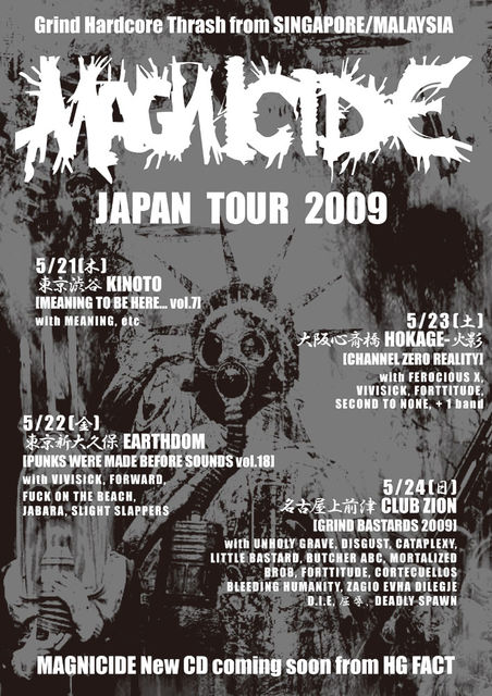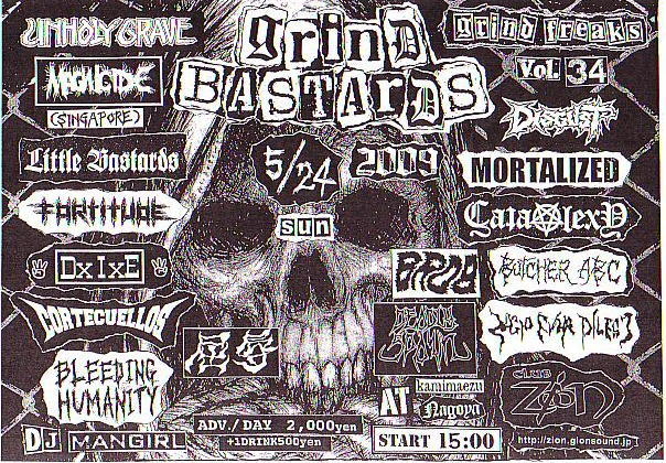 5/24 (日) 名古屋上前津CLUB ZION http://zion.gionsound.jp/ GRIND BASTARDS 2009 UNHOLY GRAVE MAGNICIDE(from SINGAPORE) DISGUST LITTLE BASTARDS CATAPLEXY BUTCHER ABC MORTALIZED D.I.E. BROB FORTTITUDE CORTECUELLOS BLEEDING HUMANITY ZAGIO EVHA DILEGJ 屈辱 DEADRY SPAWN START 15:00 ADV / DOOR \2,000