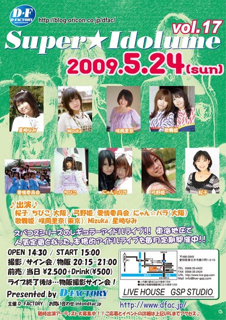 スパコスPresent's 『Super☆Idolume vol.17』 日時:2009.5.24(sun) 名古屋・LIVE HOUSE GSP STUDIO 出演: ・咲岡里奈(東京)(初) ・にゃん☆パラ(大阪) ・ちびみら。(大阪) ・愛情委員会(初) ・Mizuka ・星崎なみ ・歌舞姫 ・弓野姫 ・Die Liebe ※出演順未定 OPEN:14:30 START:15:00〜 撮影サイン会・物販:20:15〜21:00 前売・当日:\2,500+D(\500) ☆チケット予約は出演者アドレスまで 『Super☆Idolume』コミュ http://mixi.jp/view_community.pl?id=2759364 『Super Cospl