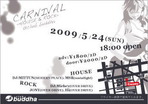 管理人様、勝手な告知失礼します。 不適切であれば、削除お願いします!! 今回で3回目のCARNIVALを5/24(SUN) 18:00〜buddhaで開催します。 ジャンルはHOUSEとROCKなので、HOUSE好きもROCK好きもどちらも楽しめると思います。 今回は日曜日の夕方からSTARTなので、ぜひ早い時間から楽しみましょう☆ ■CARNIVAL-HOUSE & ROCK-@club buddha ■2009/5/24(SUN) 18:00open(〜1:00) ■adv:\1800/2D door:\2000/2D フライヤー持参orキャッシャーでDJの名前を言えば前売りで入れます!! ■HOUSE DJ MITTUN(MODERN P