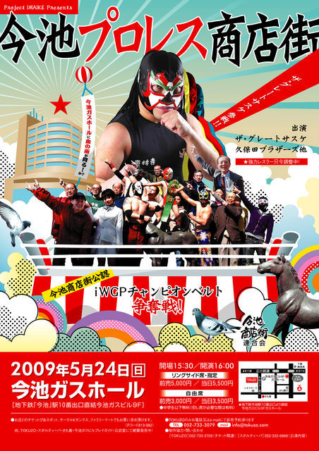 今池商店街のやきとり屋のケンです この度商店街ではこんな企画しています、 地元名古屋の選手も大勢参戦します、お時間がある方は是非観戦、応援お願いします まだまだ名古屋のプロレスは熱い! 興行名:Project IMAIKE プレゼンツ 今池プロレス商店街 日程:2009/05/24(日) 開場:15:30 開始:16:00 会場:名古屋・今池ガスホール 住所:名古屋市千種区今池一丁目8−8 【チケット料金】 リングサイド席・指定席:前売 5000円/当日 5500円 自由席 :前売 3000円/当日 3500円 立ち見に限り中学生まで無料