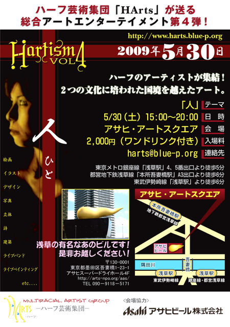管理人の Jimbo です。 「Hartism Vol.4 〜人〜」 の詳細が決まりましたので、出展者を大募集します!!! 会場協力はなんとアサヒビール!!! 浅草の有名なあのビル(フライヤー参照)で行います!!! アサヒアートスクエアのサイトでは既に告知されています: http://www.arts-npo.org/aas/event/2009y5m30.htm Hartism 史上最大のスケールでお送りしますので、是非是非ご参加ください! ★★★★★★★★★★★★★★★★★★★★★★★★★★★★★★★★★★★★ ●イベント名: 「Hartism Vol. 4 〜人〜」 ●テーマ:
