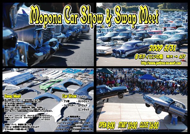 Mopona Car Show &Swap Meet 2009 5/31 @ポティロンの森 雨天→6/7 http://www.potiron-no-mori.com [OPEN] 8:00 [START] 10:00 [CLOSE] 16:00 SwapMeet 個人売買 アメ車 一人一台でお願いします。 なるべく分かりやすく 金額提示お願い致します。 あくまでも個人売買なので 当人同士の話し合いできめてください。 車のパーツ または 車関連の物「洋服、その他」 何か一つ持ってきていただけるよう、お願い致します。 なお 偽ブランド品等の販売はその場で撤去していただきます。 カーショー スペース 2.
