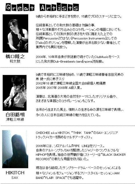 和太鼓Dub Breakbeat Band [ngoma]の太鼓奏者 橋口隆之と、 津軽三味線奏者 白田路明によるお気楽レストランライブシリーズ開催決定! 絶品California Cuisineのお店、祐天寺HATENA?RECIPEにて おいしいお料理に舌鼓を打ちつつライブを楽しめます。 初回の今回はTHINK TANKエンジニアのCHE3 CHEEことHIKITCHさんがライブセットで参加。 オーナーシェフ自体が音楽にどっぷりなHATENA?RECIPEでしかありえない取り合わせです。 ライブチャージとお料理と1ドリンクで3000円はお値打ち価格! 立食パーティー形式で気楽な感じなので日曜