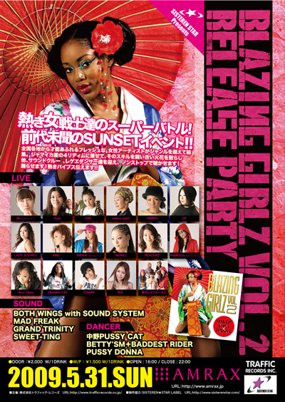 熱き女戦士達のスーパーバトル! 前代見門のSUNSETイベント!! 5.31 この日、渋谷が17人の女戦士達の熱いバイブスで燃えがる!! _______________________________________________________________ 今レゲエ好きな女の子の間で最も話題の 熱き女達のスーパーバトルコンピレーションアルバム 「BLAZING GIRLZ VOL.2」 Traffic Inc.の妹分、Traffic Records Inc.より シストレンスターレーベル シリーズ第二弾として、 3月25日、待望のリリースを遂げた!! この「BLAZING GIRLZ VOL.2」のリリースを祝い、 5月31日(日)渋谷アマテラグジ