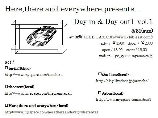 告知失礼します Here,there and everywhere presents! 「Day in & Day out」vol.1 5/31(Sun)木屋町CLUB EAST 京都を中心に活動中の平均年齢20歳バンドHere,there and everywhereによる初企画! 計5バンドによる、「日常をよりリアルにより身近に」をコンセプトにした企画 act / ■birth(Tokyo) 常にスリリングな楽曲の展開は聴く側に緊張感を与え、さらにその音楽性からは納得せざるおえない説得力を放っている。 http://www.myspace.com/tenohira □the lions(local) 京都に限らず全国各地でその名を轟かしている。ディスト