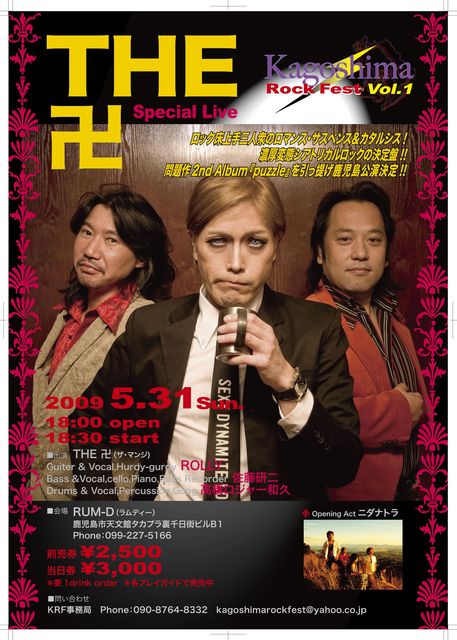 現在NHK連続テレビ小説『 つばさ 』に浪岡正太郎役で出演中!元すかんちのマルチアーティスト・ROLLY、元マルコシアス・バンプの佐藤研二、THE SONS、元X-RAYのロジャー高橋・・・からなるスーパー・ロック・バンド ・・・THE 卍(ザ・マンジ)が初来鹿します。  5月2日リリースのTHE 卍2ndアルバムは、劇的シアトリカルなロックアルバム。  昭和歌謡をイメージしつつも、ブラックサバスにメタリカにフラワートラベリンバンド、グランドファンクレイルロード、かたや、コニー・フランシス、ヘンリー・マンシーニ、リック・デリンジャー