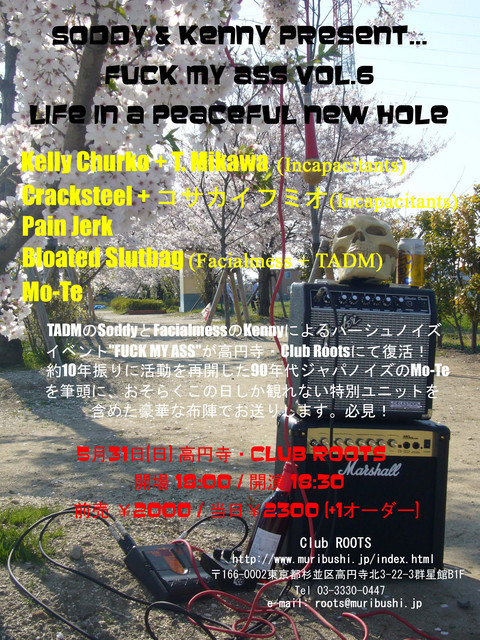 Soddy & Kenny present... "FUCK MY ASS vol.6: Life in a Peaceful New Hole" 5月31日(日) 高円寺・Club Roots 開場 18:00 / 開演 18:30 前売 ¥2000 / 当日¥2300 (+1オーダー) 出演: Mo-Te Pain Jerk Kelly Churko + T. Mikawa (Incapacitants) Cracksteel + コサカイフミオ (Incapacitants) Bloated Slutbag (Facialmess + TADM) TADMのSoddyとFacialmessのKennyによるハーシュノイズイベント "FUCK MY ASS" が高円寺・Club Rootsにて復活! 約10年振りに活動を再開した90年代ジャパノイズのMo-Teを筆頭に、おそらくこの