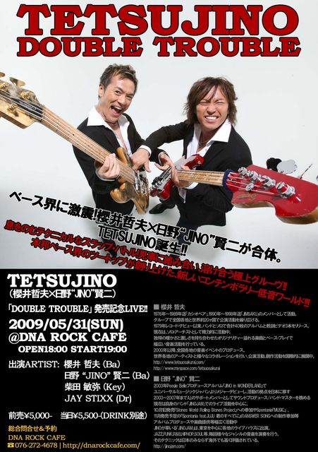 櫻井哲夫と日野”JINO”賢二が合体!“TETSUJINO”(テツジーノ)誕生!! 息をのむテクニカルなスラップ・バトル!見事に絡み合い、溶け合う極上グルーヴ!! 本邦ベース界のツー・トップが創り上げた、新しいコンテンポラリー低音ワールド!!! ベーシストならずとも、こもグルーブ感・・・必見必聴です!! プロフィール ★櫻井哲夫 「カシオペア」をはじめとし、バンドやソロとして活動。 グループで全国各地と世界約20ヶ国で公演活動を繰り広げる。1979年レコード・デビュー以来、バンドとソロで合計40枚のアルバムをリリース。教則
