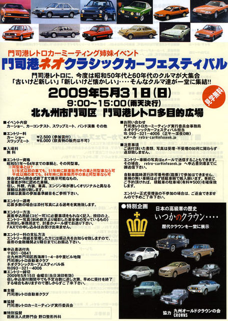 2009年5月31日(日)に門司港レトロ地区にて 門司港ネオクラシックカーフェスティバルが行われます。 エントリー資格は 昭和51年から64年迄の車両とその同型車です。 但し、外観、内装、車高、エンジン等が著しくオリジナルと異なる 車両はお断りいたします。 問い合わせ先 門司港レトロカーミーティング実行委員会事務局 ネオヒストリックカー担当  TEL093−321−4006(正午〜深夜0時) e-mail retoro-car@infoseek.jp コミュニティも設定されています。 門司港ネオクラフェスタ http://mixi.jp/view_commun