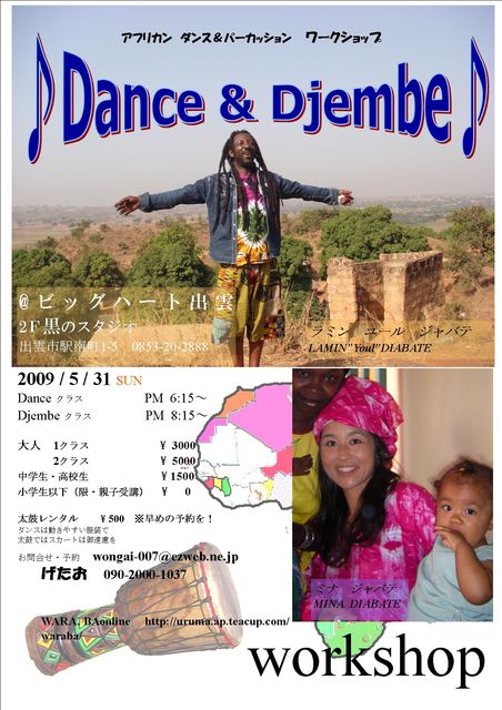 http://uruma.ap.teacup.com/waraba/448.html 5/31【島根 アフリカンダンス&パーカッション ワークショップ】 YOUL & MINA DANCE & DJEMBE Workshop @ SHIMANE 2009/ 5/31 (sun) @ビックハート出雲 2F 黒のスタジオ(出雲市駅南町1-5 TEL: 0853-20-2888)  出雲市駅前 アフリカンダンスクラス  6:15-7:45 pm 太鼓(ジェンベ)クラス  8:15-9:45 pm 【参加費】 大人   1クラス ¥3,000      2クラス ¥5,000 中・高生      ¥1,500 小学生以下     ¥0(親子で受講の場合) *太