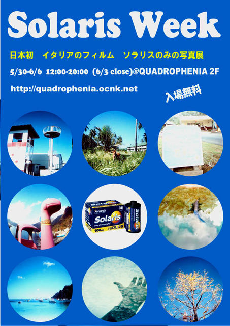 管理人様、貴重なスペースを失礼いたします 不適切でしたら削除頂ければ幸いです 珍しいイタリアのフィルム ソラリスのみのグループ写真展 Solaris Weekを開催します 5月30日から6月7日(1日 延長となりました) @QUADROPHENIA 2F 12:00-20:00  入場無料 *3日は定休日の為 展示行われておりません  イタリアの伝統ある写真機材メーカーFerrania社が生産するフィルムSolaris 国産フィルムには無いその独特な発色から多くの愛好者がいるソラリスのみで、撮影された写真展になります デジタルカメラはSDカードのメーカーが