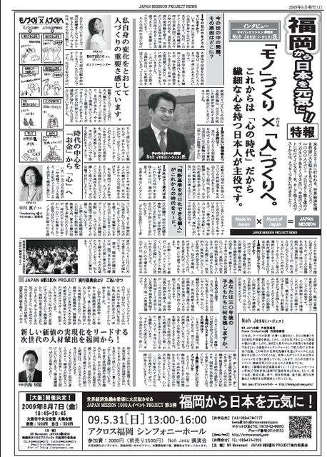 いよいよ明日、福岡から日本を元気に! ジャパンミッションプロジェクトのイベント開催です  日時:2009年5月31日(日) 13:00〜16:00(受付開始12:15) 会場:アクロス福岡シンフォニーホール (http://www.acros.or.jp/) 料金:2000円 (前売り1500円) ゲスト紹介 中川真子さんとモルフィ、ノ・ジェス氏です。 中川真子さんはご自身で作詞、作曲をされていて、その中でも Awakening all of the soulsは聞いていて魂が振るえ、感動を多くの人に与える曲で、僕も大好きな曲です。 中川 真子ブログ http://ameblo.