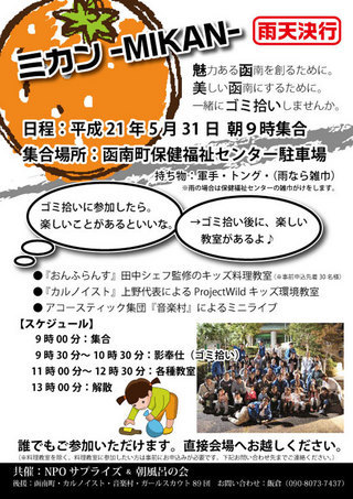 魅力ある函南を創るために。美しい函南にするために。 一緒にゴミ拾いしませんか。 →ゴミ拾い後に、楽しい教室があるよ♪ ◇◆◇─────────────────────  日程:2009年5月31日(日曜日)  集合時間:9時00分から  集合場所:函南町保健福祉センター駐車場       [函南町平井717番地の28]      ─────────────────────◇◆◇ ◆『おんふらんす』田中シェフ監修のキッズ料理教室 ◆『カルノイスト』上野代表によるProjectWILDキッズ環境教室 ◆アコー