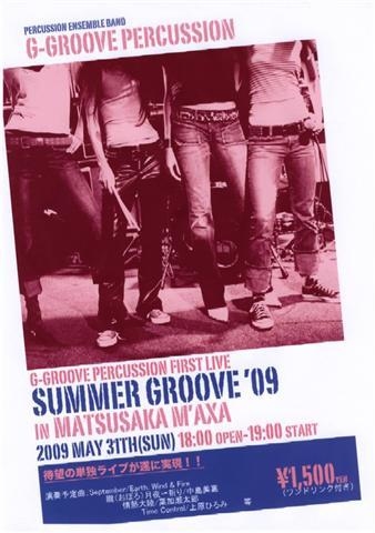(2009年3月10日再更新) 定演で告知されたからここにも載せちゃいます 来年4月で3年目を迎えるG-Groove Percussion は、念願の単独ライブをやることとなりました <ライブ詳細> G-Groove Percussion First Live "SUMMER GROOVE '09" 開催日:2009年5月31日(日)夜2時間ほど 開場:18時、開演:19時 会場の詳細はこちら・・・ M'AXA http://www.maxa.jp/ http://mixi.jp/view_community.pl?id=1605450 演奏予定曲: ・September(Earth,Wind&Fire) ・おぼろ月夜〜祈り