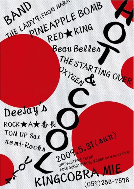 まいど告知失礼します *************************************** 2009/5/31(SUN) HOT&COOL VOL.4 @ KINGCOBRA MIE ◆BAND◆ THE LADY 9 (From NARA) PINEAPPLE BOMB RED*KING Beau Belles THE STARTING OVER OXYGEN ◆DJ◆ TON-UP Sat (From NAGOYA) ROCK*A*番長 nomi-Rocks OPEN & START 18:30 ADV./DOOR 1500/2000YEN(with Drink 500YEN) KINGCOBRA MIE (059)256-7578 http://king-cobra.net/mie/top **************************