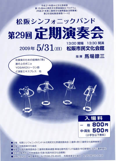 突然の書き込み失礼致します。 当団は、三重県松阪市を中心に活動しています、 「松阪シンフォニックバンド」というアマチュアの吹奏楽団です。 演奏会開催のご案内をさせていただきます。 『松阪シンフォニックバンド第29回定期演奏会』 ■日時 2009年5月31日(日) 開演13:30(開場13:00) ■場所 松阪市民文化会館(松阪市川井町690) ■入場料(前売り・当日一律) 一般 800円 中学・高校生 500円 小学生以下 無料 ■指揮 馬場鐐三 (音楽監督・常任指揮者) ■チ