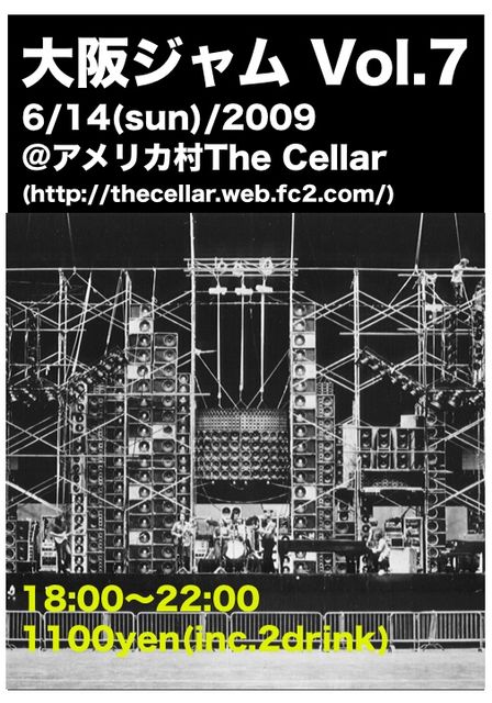 大阪ジャムバンド作ろう会の皆様、6月もまたまたやります! 第7回定例ジャム大会です。題して 大阪ジャムVol.7! ●日時 6月14日日曜日 午後6時から午後10時まで ●場所 大阪アメリカ村 The Celler Bar (http://thecellar.web.fc2.com/) ●お願い 2ドリンク制(\1000)プラス機材維持費(¥100)です。1100円でジャムって呑んでくつ ろいで、かなり楽しいことになりそうです。 参加できそうな人はパートなど書き込んでください。アポなしドタキャン問題ないです。来れる人はどなたでも。詳細はコミュニティーの説明と同じです。