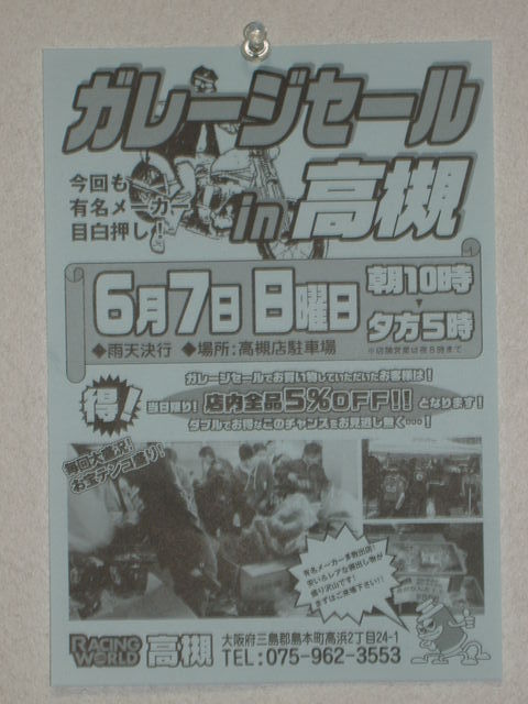待ちにまったぁ〜 バーゲンですぅ〜 みんなで戦場へ行きましょう お安くGETできたものを 自慢しあいましょう 日時 6月7日(日)雨天決行 場所 高槻レーシングワールド 時間 8:30 (まだ未定ですけどぞ〜) *現地集合・現地解散ですよぉ〜