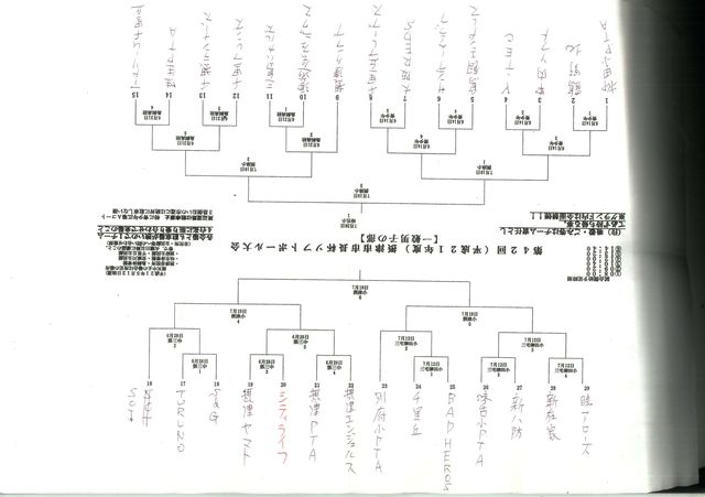 まだ体協杯が終わっておりませんが、市長杯の抽選会に行ってきました。 一回戦は摂津ヤマトさん、勝てば一試合空けて13時20分から摂津エンジェルスさんと摂津PTAさんの勝者と試合になります。 優勝も可能に思えてきた今日この頃。 本当に優勝しちゃいますか。 出欠お願いします。 第3中(摂津市学園町1丁目3番1号) http://map.yahoo.co.jp/pl?lat=34.78229889&lon=135.56201806&p=%E6%91%82%E6%B4%A5%E5%B8%82%E5%AD%A6%E5%9C%92%E7%94%BA1%E4%B8%81%E7%9B%AE3%E7%95%AA1%E5%8F%B7&ei=UTF-8&type=scroll&mode=map&sc=5 には9時40分集合