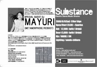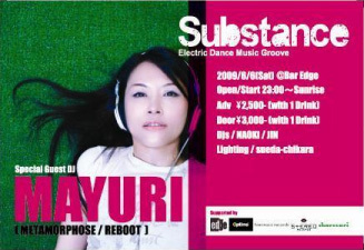 前回、DJ WADA(Co-Fusion)を招聘し、Groove溢れるフロアを演出した『Substance』。 第2回目の開催となる今回のゲストにDJ MAYURIの出演が決定した。 もはや日本最大のダンスミュージックフェスティバルと呼ばれ『METAMORPHOSE』を主宰しながらも、日本のテクノシーンの礎の1つとなった『REBOOT』のレジデントDJを10年以上も務め、まさしく日本のシーンを牽引し続ける存在である、女帝『MAYURI』の醸し出す、最先端のGrooveを是非感じ取って欲しい。 Substance 2009/6/6(Sat) @bar edge Open/Start 23:00〜Sunrise Adv /¥2,500-(w