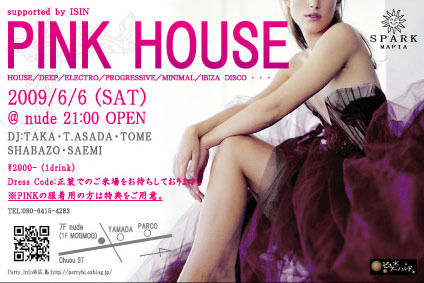 THANKS FOR YOUR COMMING ! ! NEXT SPARK PARTY ↓ ↓ P I N K H O U S E ! ! 6 / 6 ( S A T ) 2 1 : 0 0 〜 O P E N @ N U D E ¥ 2 0 0 0 − * PINKの服着用の方は特典をご用意!! * DRESS CODE D J / D J / D J TAKA (SPARK MAFIA) T.ASADA (NUDE) TOME (