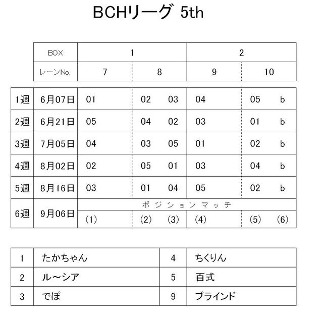BCHリーグの第6シーズンを2009年6月から開始します。 つきましては、リーグ参加希望の方はイベントへの参加をお願いします。 リーグの細かい詳細は変更になる可能性がありますが、5thで行った個人戦が好評なので、今回も個人戦にしようと思います。 <参加資格> ・ボウリング同好会@広島のメンバーであること ・広島パークレーンの会員であること(会員で無い人でもリーグ初日に会員登録可能です) <開催日時> ・毎月第1、第3日曜日(都合により変更になる場合があります) 18:00〜練習投球(10分間)開始 <参加費>