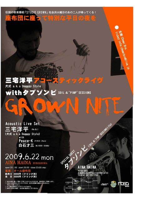 管理人様、告知を失礼いたします。 『GROWN NITE』@広島AINA HAINA 三宅洋平アコースティックライヴwithタブゾンビ 伝説の音楽番組「STUDIO GROWN」社会派火曜日のあの二人が帰ってくる! 犬式の活動をひとまず終えた三宅洋平がソロ活動を本格的にスタート。 ソロとしては初めてとなる広島では、SOIL & “PIMP”SESSIONSのフロントマンであり、かつて「STUDIO GROWN」で名コンビだったタブゾンビが参加。 座布団に座って特別な平日の夜をお過ごしください。 2009年6月22日(月) open 20:00 start 20:30 / close 23:00(予定