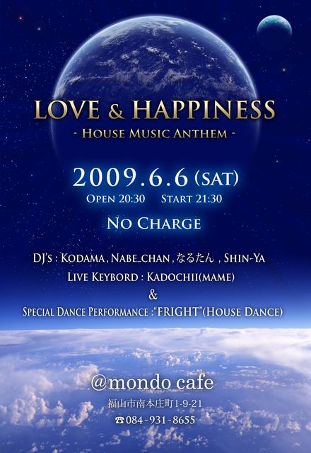 管理人様 イベント告知失礼いたします! ☆love☆& ♪happiness♪的なHOUSEイベント開催! 〜House Music Anthem〜 6月6日にHOUSE系イベントを福山のモンドカフェのDJ Shin-yaさん達と開催! DJ's Kodama,Nabe_chan,なるたん,Shin-Ya Live Keybord Kadochii(mame) Special Dance Performance "FRIGHT" (House Dance) 時間は、21時30分から〜! ノーチャージだよ! 「MONDO CAFE」 広島県福山市南本庄町1-9-21 084-931-8655 20:30〜Midnight Alcohol 500〜 / SoftDrink 300〜 ↓mon