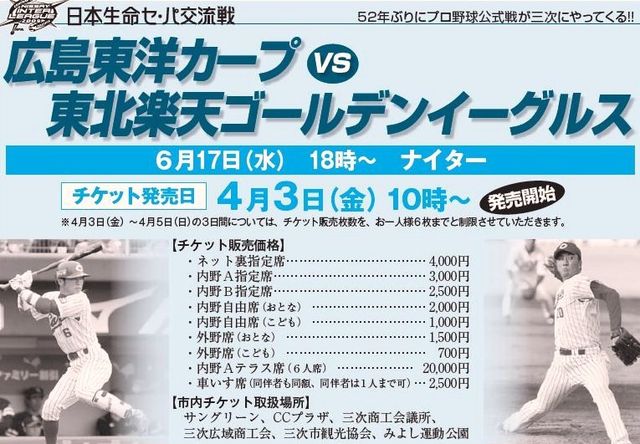 三次市の新球場のこけら落としであるセ・パ交流戦 広島東洋カープVS東北楽天ゴールデンイーグルス この試合を見に行きたいと思います。 日時:2009年6月17日(水)18:00〜 内容:セ・パ交流戦 広島東洋カープVS東北楽天ゴールデンイーグルス 平日の夕方、早い時間からのスタートという事もあり 自由席で場所取りをするのは難しいので 内野の指定席にしたいと思います。 これなら多少、遅れて来られてもOKですね。 で、同じ内野指定ならテラス席を取れればいいかな、と思うのですが 皆さんは、どうでしょう