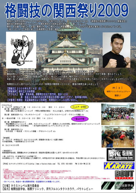 関西から世界を目指すファイターのみなさん、お待たせしました。 2009年6月14日、「格闘技の関西祭り2009」開催決定! 最先端の格闘技医学トレーニングと、参加者同士の技術交流が合体した「祭り」シリーズ。東京、名古屋、沖縄など、全国で展開され、K-1戦士やプロ格闘家、トップクラスのカラテ選手も参加しているこのイベントは、「強くなること」の本質と楽しさを再発見する貴重な機会。 ナビゲーターは、格闘技を医学的に研究、その成果を選手に実践している格闘技ドクター、二重作 拓也(格闘クリニック代表、格闘技医学