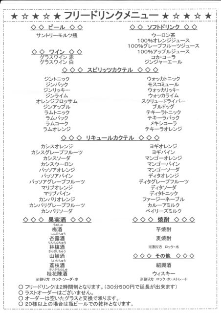 mixiコミュニティご参加ありがとうございます。 こちらの会員さんを対象にオフ会をさせていただきます。 定休日を利用して、スタッフはもちろんお客様同士、ワイワイ話をしながら、意見も聞ける場にしたいと思います。 下記参照の上、参加確定の方のみ書き込みと参加希望ボタンをお願いいたします。 ---------------------------------------------------------------- 6月17日(水) 17時半〜20時のフリータイム。遅刻。早退可。 料金 1050円 1ドリンクと1000円分のポイント付。お帰りの際に普段のプレゼント用と