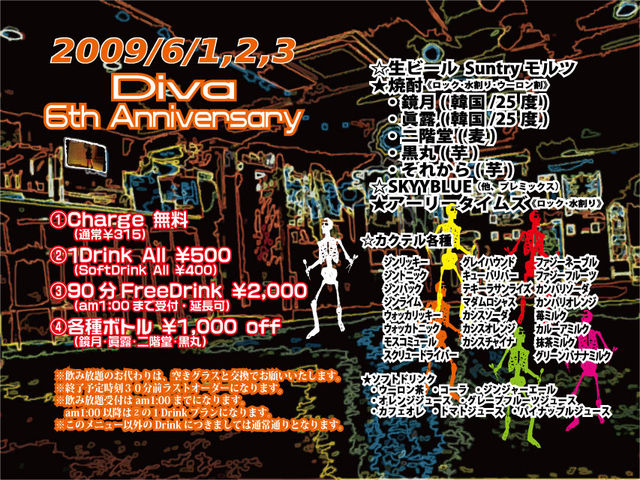 皆様、日頃Divaをご愛顧誠にありがとうございます。 おかげ様で、Divaは5/30に6周年を迎えます。 気がつけば、6年… アッという間の、6年… まだまだ、6年… 日頃の感謝を込めまして、 日の押し迫ったお知らせとなってしまいましたが、 来週6/1(月)〜3(水)の3日間、 下記の内容にて皆様をお迎えさせて頂きたいと思います。 お時間ありましたら、是非お立ち寄り下さいませ。 これからもDivaをよろしくお願いいたします。 Diva代表 テラモトケイイチ 『Diva6周年サービスメニュー』 ?Charge無料 ?1Dr