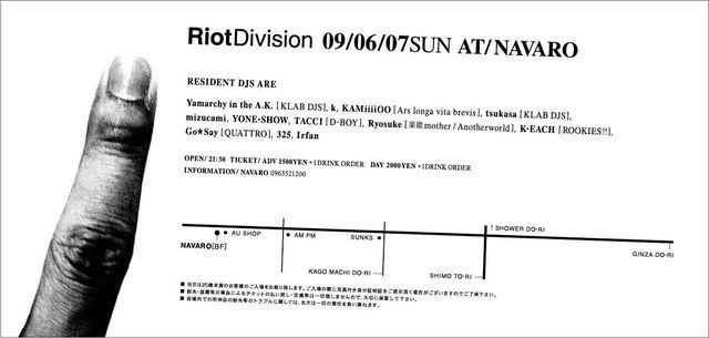 イベント告知です! 管理人様、失礼致します。 80年代後半、マンチェスターで巻き起こったマッドチェスタームーヴメント。 そこからインスパイアされた、Kumamoto Fuckin' New Generationによる ファッションピープルのためのイベント、、、 " Riot Division " 2009.6.7 sun AT / NAVARO REGIDENT / Yamarchy in the A.K. [ KLAB DJS ] k KAMiiiiOO [ Ars longa vita brevis ] tsukasa [ KLAB DJS ] mizucami YONE-SHOW TACCI [ D-BOY ] Ryosuke [ 楽脳 mother / Anotherworld ] K-EACH [ ROO
