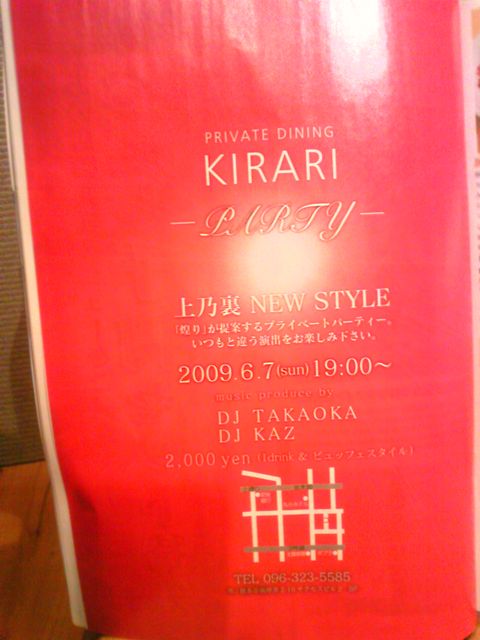 今回、新しいスタイル ここ上の裏通りに色んな出会い&新しい風&遊び場を そんな思いで いつもの居酒屋スタイルとは全然違う店のスタイル 食事しながら DJパフォーマンス 音楽にノリながら人と人の繋がりを広めて 美味しいお酒を飲む そんなPartyをやっちゃいます。。 今回ゲストに 熊本クラブシーンで活動中の DJ→KAZ DJ→TAKAOKA 2009.06.07.Sunday AT.煌り 19:00start DOOR.2000YEN WITH FOOD&1DRINK 煌りにてチケット発売中 TEL.-81-96-323-5585