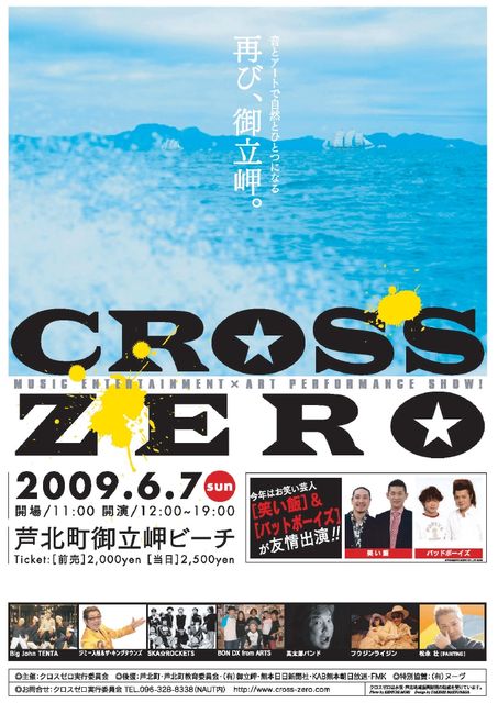 新たな夏フェス、海フェス、エコフェス『CROSS ZERO』 2009年も開催決定!! CROSS ZEROとは、 クロス(=人と人との交わり、人と自然との共存) ゼロ(=原点に返る、いつまでも変わらない) ということを意味しています。 ”クロスゼロ”をテーマに、”海・エコ・ロハス”をコンセプトに 御立岬ビーチを舞台に九州で活躍中のバンドが出演します。 音楽の他、熊本のグラフィックデザイナー、松永壮によるライブペイント。 地元芦北の小学生によるエコ絵画コンクール。 来場者の思いを一つにするエコツリーの制作。マイ箸作