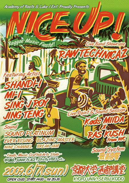 Big up. 「NICE UP!」@京都大学西部講堂(京都市左京区吉田本町) OPEN[13:00]〜LAST[20:30] ■LIVE BAND RAW TECHNICAZ ■LIVE ARTIST SHANDI-I / Mi-I / Sing J Roy / JING TENG ■LIVE PAINT & SOUND SESSION Kads MIIDA & RAS KUSH from N.Y ■SOUND SONUND PLATINUM / EVER RISING / BLAZING MASTER / BREAK JAM / NINE CHANNEL ■SOUND SYSTEM 最高音響 ☆チケット☆ ローソンチケット0570-084-005[L-コード:59186] Strictly VIBES 075-212-0719 他 ☆問い合わせ☆ info@lake1.com / www.nice-up.com 京都で始まる新
