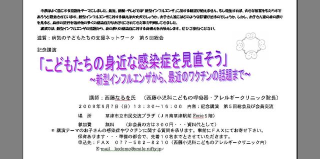 滋賀:病気の子どもたちの支援ネットワーク総会と学習会 「こどもたちの身近な感染症を見直そう!」 〜新型インフルエンザから最新の話題まで〜 今回はよく目にする話題をテーマにしました。 最近、新聞・テレビでは「新型インフルエンザ」に関する報道が絶えません。 もし発生すれば、大きな被害をもたらすであろうと懸念されています。 新型インフルエンザに対する備えは大丈夫でしょうか。 お子さん達にはどのような影響が出るのでしょうか。 しかし、お子さん達の身の回りを見ると、麻疹の流行を始め他の多くの 感染症がなおざりに