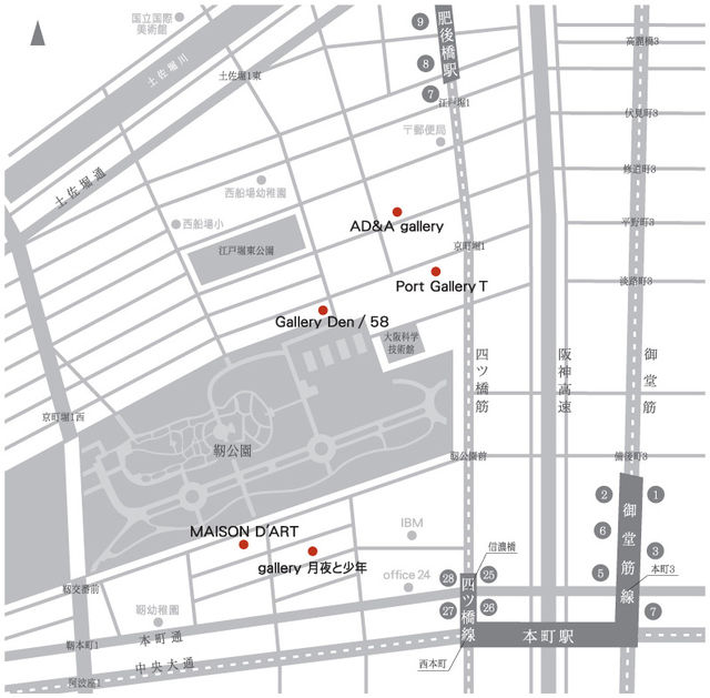 大阪市の西区に位置する緑豊かな靭(ウツボ)公園。その都会のビル群の真ん中でぽっかりと空いたエアポケットの周辺に点在する5つのギャラリーで企画された、アートを巡る街歩きをお楽しみ下さい。 マップを片手に靭公園を散策して下さい。 参加ギャラリー ・AD&A gallery ・Gallery Den ・58 (Gallery Den隣) ・gallery 月夜と少年 ・MAISON D'ART ・Port Gallery T Utsubo Art Rally 事務局 (gallery 月夜と少年 内) 〒550-0004 大阪府大阪市西区靱本町1-14-9・1F tel/fax 06.6441.6190 e-mail tsukiyo@mumble-mumble.com url http