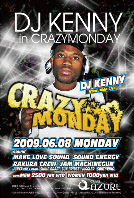 ※緊急告知※ VOICE MAIL、COLLIE BUDDZに続き 6月8日の月曜日にCRAZY MONDAY@アメ村AZUREにて FROM JAMAICAより『DJ KENNY』が来阪!!! REGGAEのMIX CDを作らせたらキングストン1すなわちジャマイカ1つまり世界1!!! 彼のMIX CDを持ってる方も多いはず!過去2回、日本での PLAY歴があり、大阪は今回が初! SEAN PAULのTOUR DJを勤めるなど今や世界からお呼びがかかる存在に。 ジャマイカ直通の時差のないSOUND PLAYを体験するべし! DJ KENNY インタビュー http://www.youtube.com/watch?v=-EEQSuWgRRY 料金はこちらで確認して