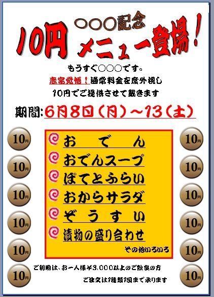 もうすぐ○○○です。 赤字覚悟!通常料金を度外視し 10円でご提供させて戴きます 仕入れの都合上 詳しいメニューは当日に お知らせいたします どうぞお楽しみに。 ご利用は、 お一人様¥3,000以上 のご飲食の方 ご注文は1種類1回まで承ります 美味しいものばんざい!